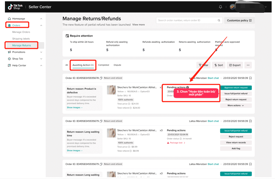 ① Phê duyệt yêu cầu trả hàng/hoàn tiền: Nhà bán hàng có thể phê duyệt yêu cầu hoàn tiền và chọn Đồng ý hoàn tiền một phần/toàn bộ để bắt đầu hoàn tiền một phần.