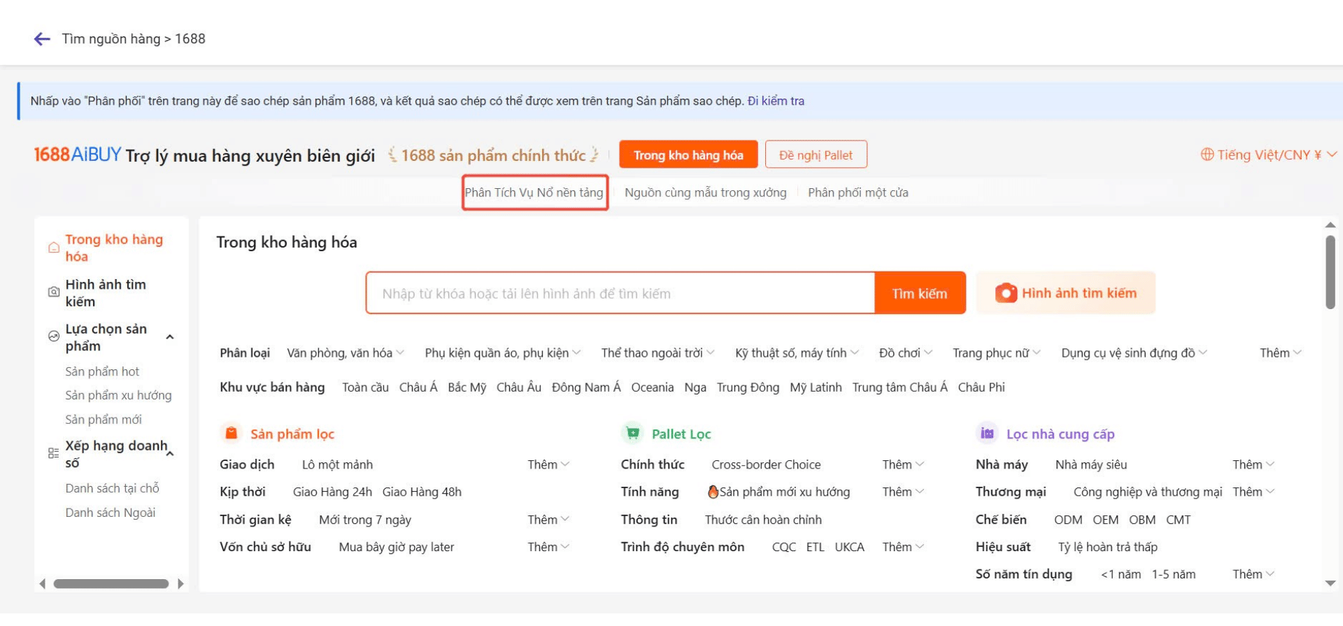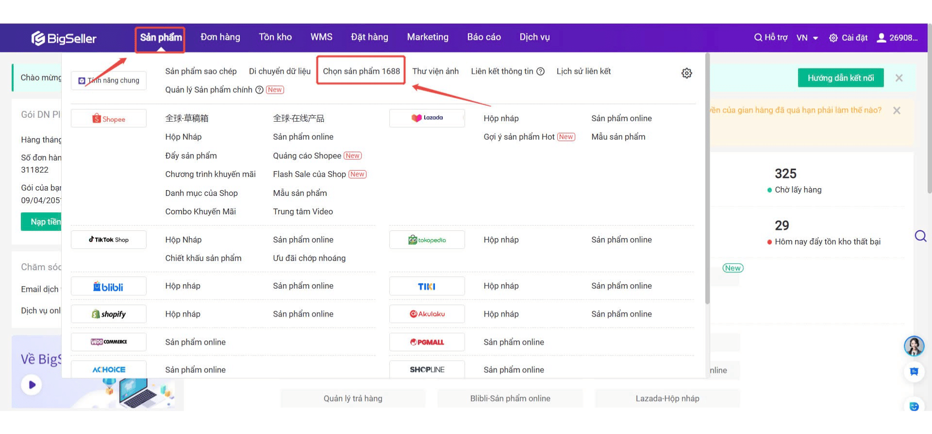 1688 là nền tảng mua sắm nội địa thuộc Tập đoàn Alibaba, chủ yếu phục vụ các nhà bán hàng Trung Quốc và các doanh nghiệp vừa và nhỏ, cung cấp mức giá ưu đãi tương đối thấp và nhiều loại hàng hóa phong phú. Các nhà bán hàng ở Việt Nam có thể mua hàng trực tiếp từ Trung Quốc thông qua nền tảng 1688, do đó giảm chi phí mua sắm và cải thiện hiệu quả mua sắm. BigSeller là phần mềm quản lý bán hàng thông qua BigSeller các nhà bán hàng có thể xem được các gợi ý hot từ 1688 để tiến hành đặt hàng.