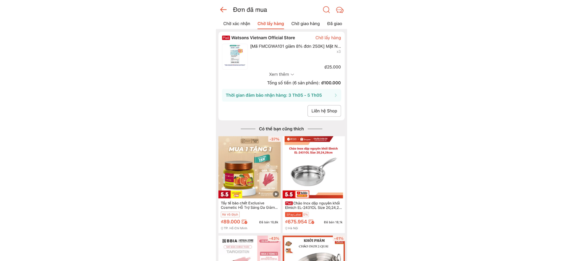 Bước 1: Vào ứng dụng Shopee chọn mục” Tôi” tiếp theo chọn” chờ lấy hàng”