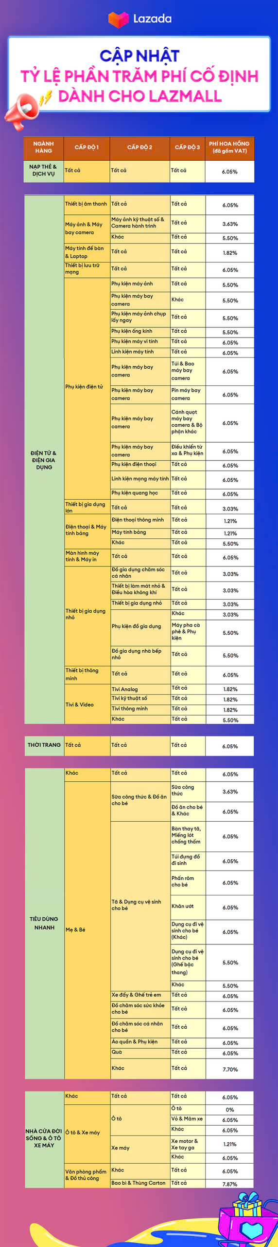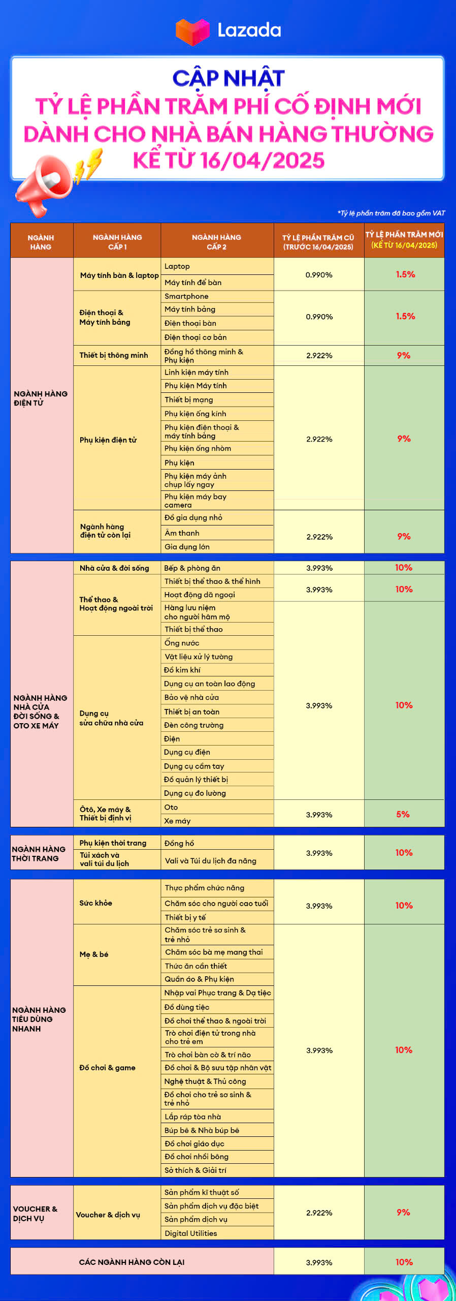 Kể từ ngày 16/04/2025, Lazada sẽ cập nhật tỷ lệ phần trăm phí cố định mới dành cho nhà bán hàng thường phí bán hàng trên sàn Lazada: