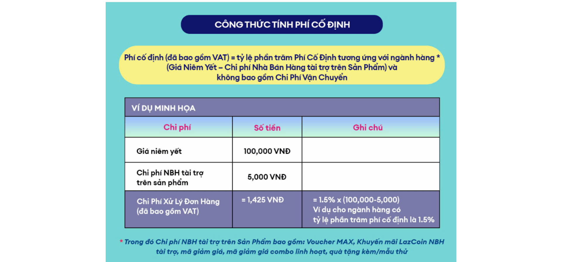 Phí cố định (đã bao gồm VAT) = tỷ lệ phần trăm phí cố định tương ứng với ngành hàng * (giá niêm yết – chi phí nhà bán hàng tài trợ trên sản phẩm) và không bao gồm chi phí vận chuyển