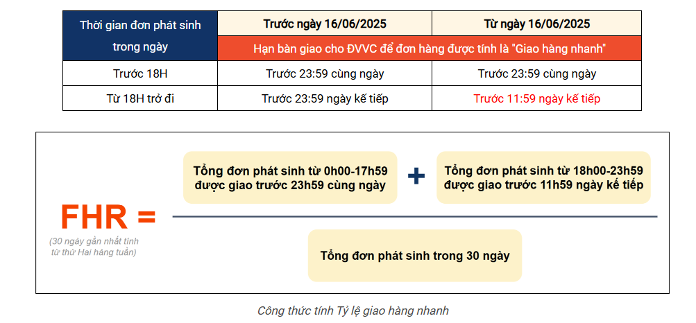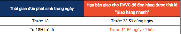 Trong đó, (*) Đối với các đơn phát sinh trước 16/06/2025, hạn bàn giao cho ĐVVC để đơn hàng được tính là "Giao hàng nhanh" được áp dụng theo chính sách trước ngày 16/06/2025 như sau: