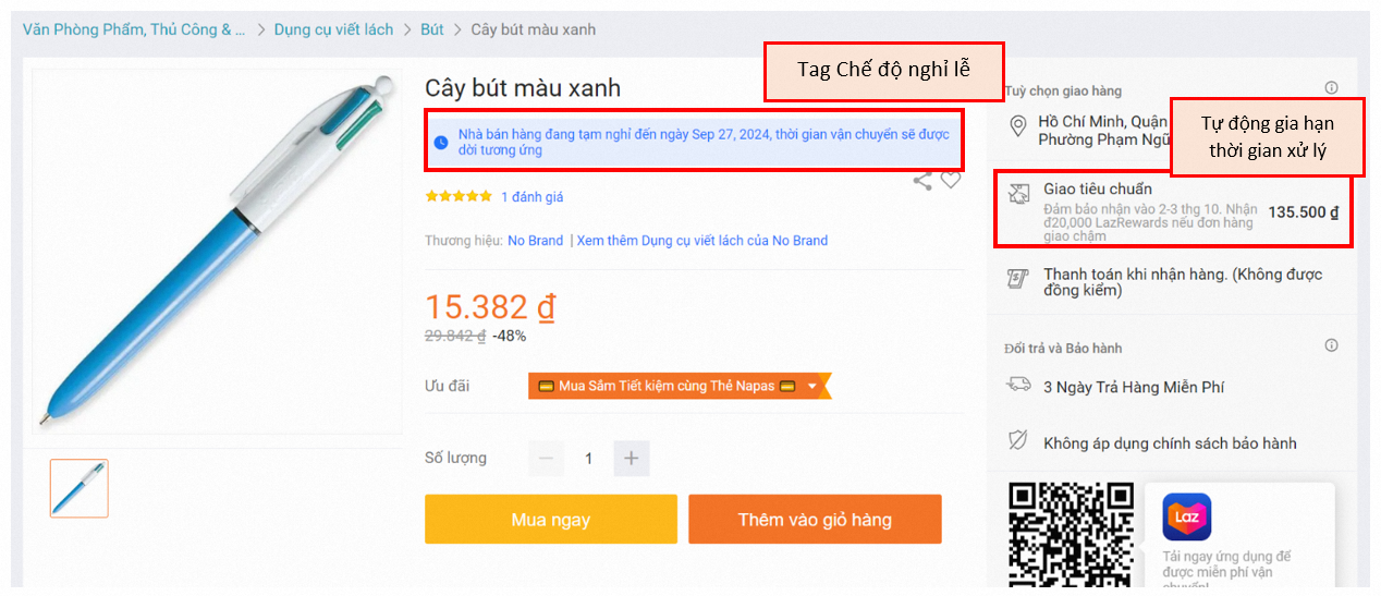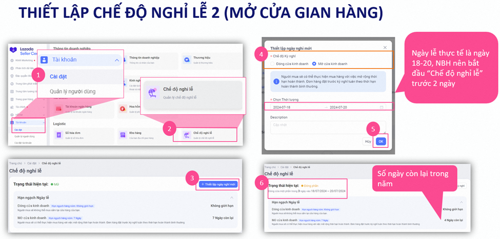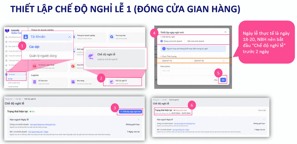 Chế độ tạm nghỉ Lazada chỉ có hiệu lực từ ngày hôm sau sau khi bạn cài đặt thành công. Do đó, NBH nên thiết lập chế độ tạm nghỉ ít nhất 2 ngày trước thời điểm bắt đầu kỳ nghỉ.