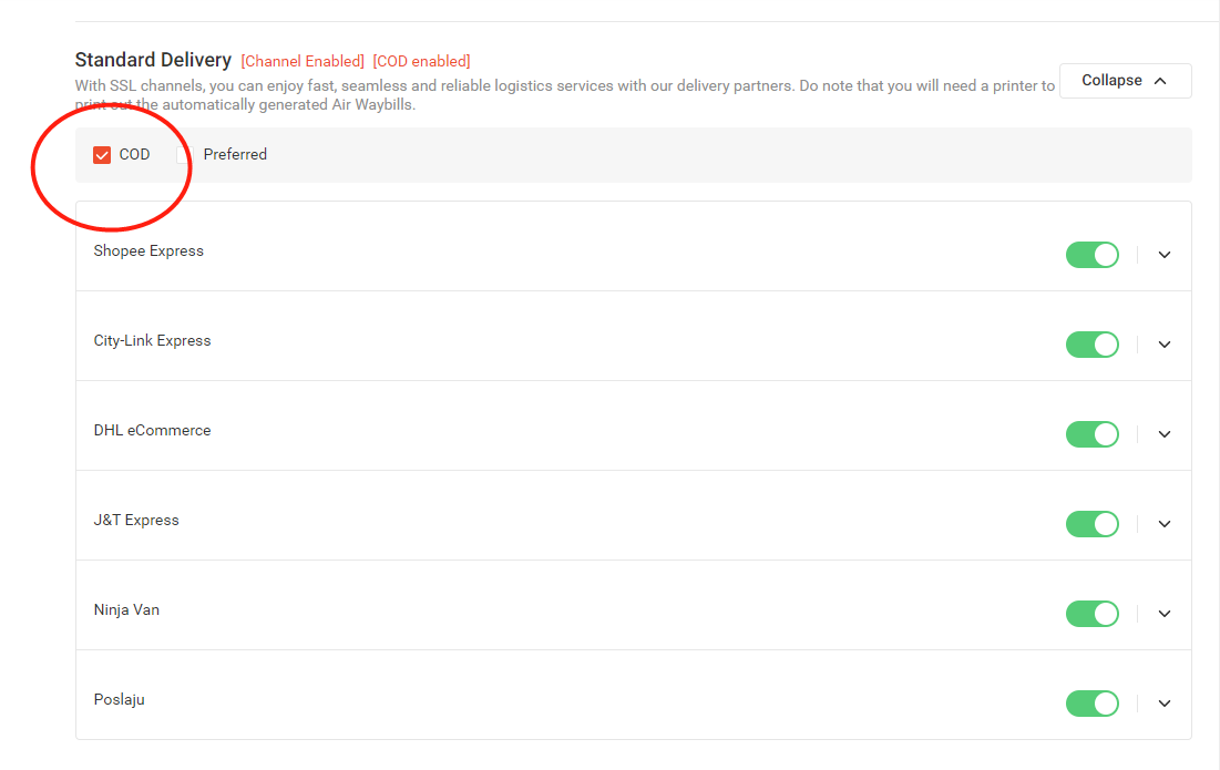 2. Toggle Enable COD for any Shopee-supported logistics partners (e.g., Shopee Xpress, Ninja Van, LBC)