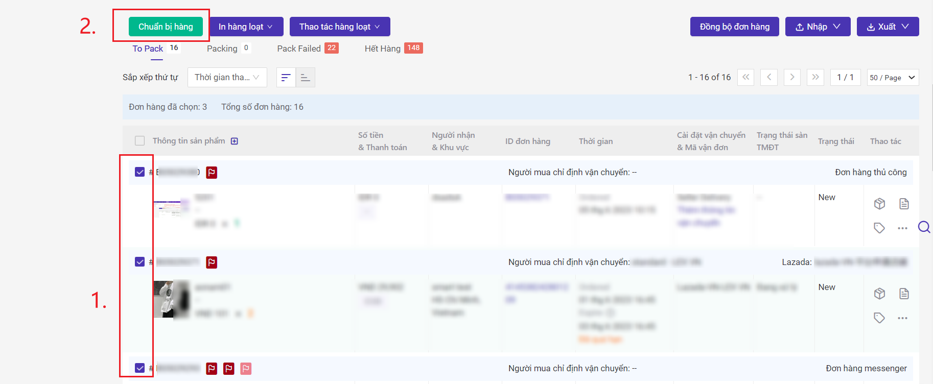 Khi có đơn hàng mới sẽ hiển thị ở mục "Chờ xử lý" > To Pack, chọn những đơn hàng cần xử lý, sau đó bấm Chuẩn bị hàng.