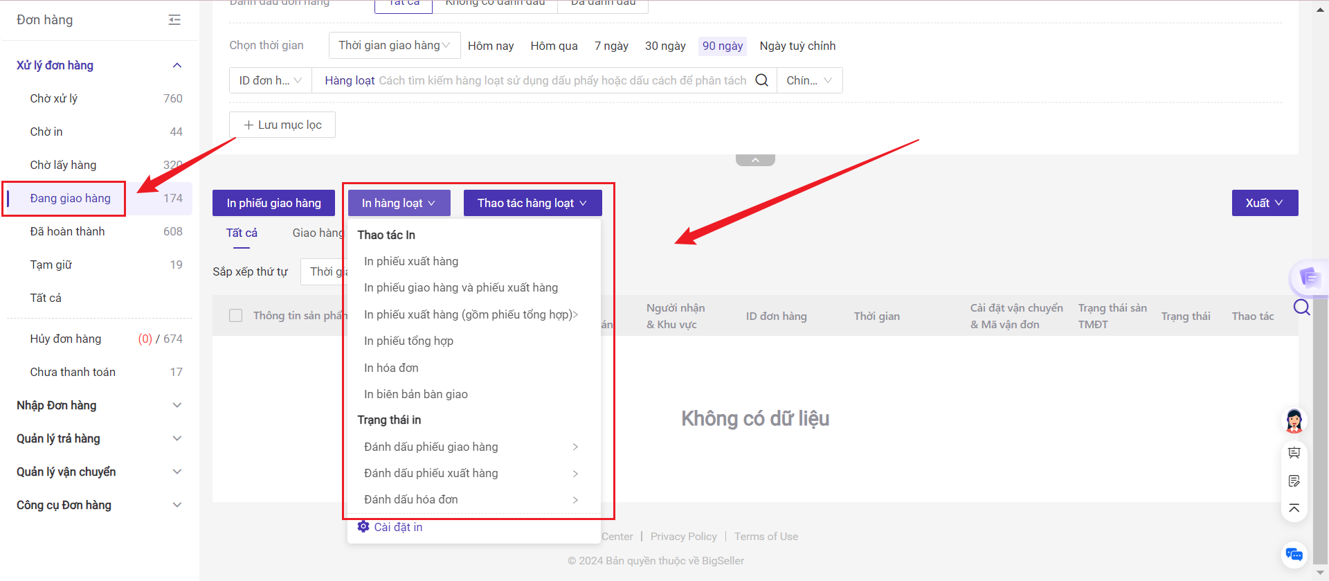 Bước 2: Thao tác in phiếu giao hàng tại mục chờ in