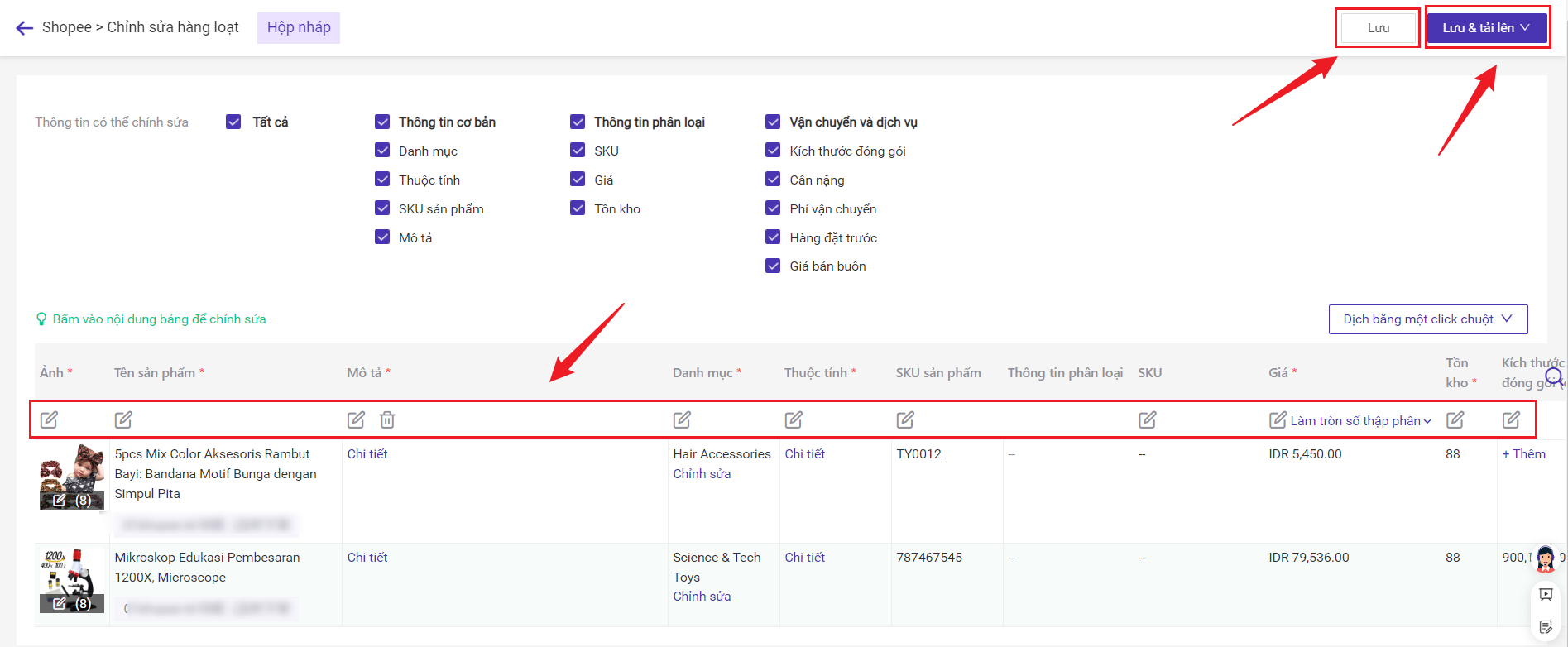 Bạn có thể tiến hành chỉnh sửa hàng loạt, cũng có thể chọn thông tin sản phẩm để chỉnh sửa từng một. Sau khi chỉnh sửa xong nhấp vào lưu & tải lên hoặc Hẹn giờ tải lên.