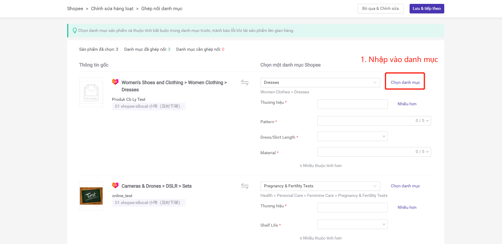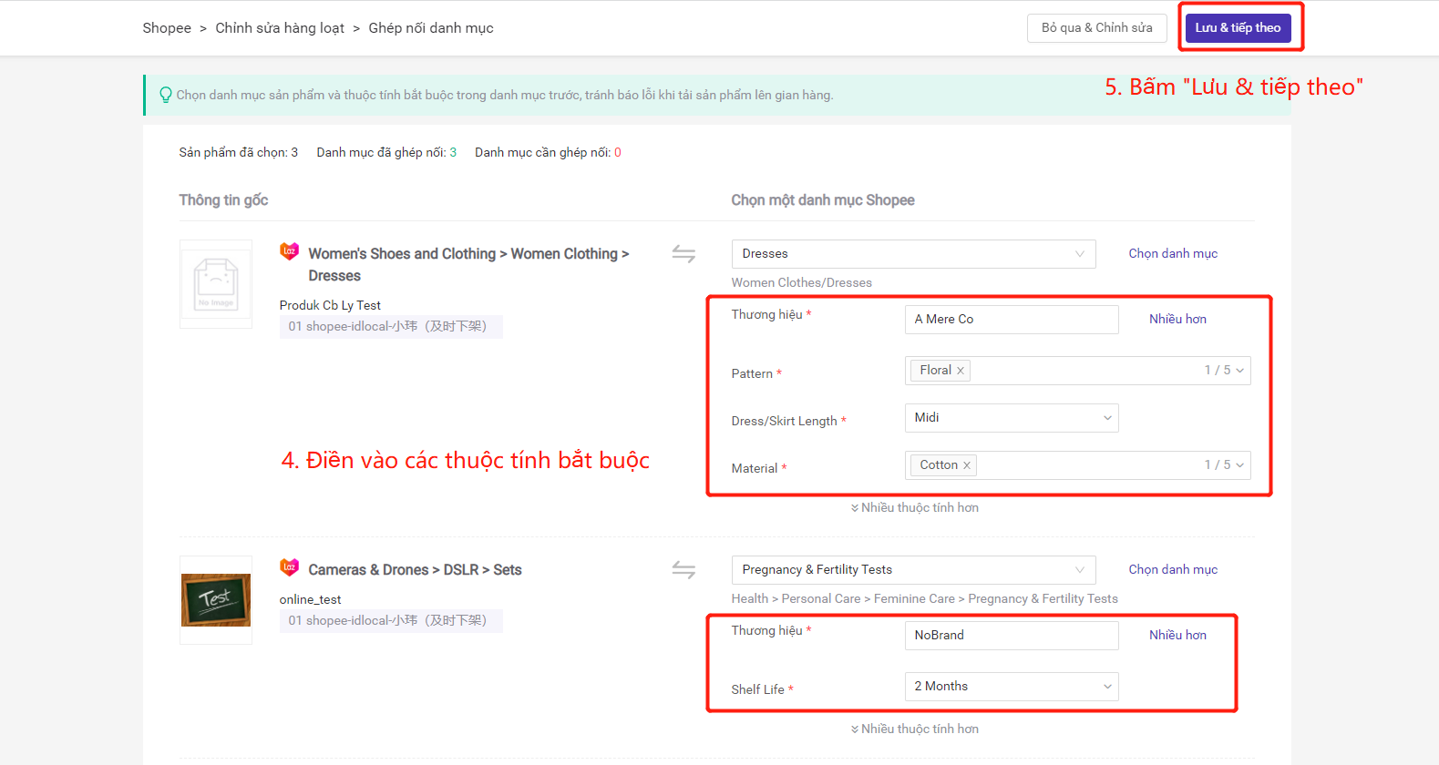 Tiến hành ghép nối danh mục > Chọn danh mục và điền vào các thuộc tính bắt buộc > Nhấp vào Lưu & tiếp theo, rồi sẽ vào trang chỉnh sửa hàng loạt.