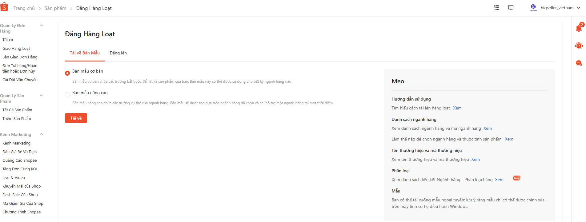 Bước 3: Nhấp mục “Tải về” để tải xuống mẫu Excel. Sử dụng biểu mẫu chuẩn của Shopee để điền thông tin sản phẩm. Có 2 biểu mẫu đăng sản phẩm hàng loạt trên Shopee: