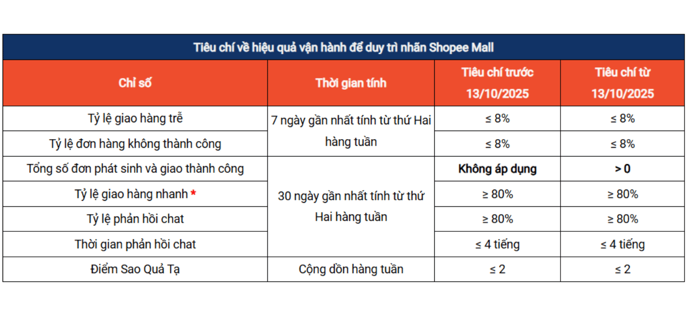 Từ ngày 13/10/2025, Shopee sẽ áp dụng bộ tiêu chí cập nhật về hiệu quả vận hành để duy trì Shopee Mall. Cụ thể, Người bán cần có ít nhất một đơn hàng phát sinh và giao thành công trong vòng 30 ngày gần nhất, được tính từ thứ Hai hàng tuần.