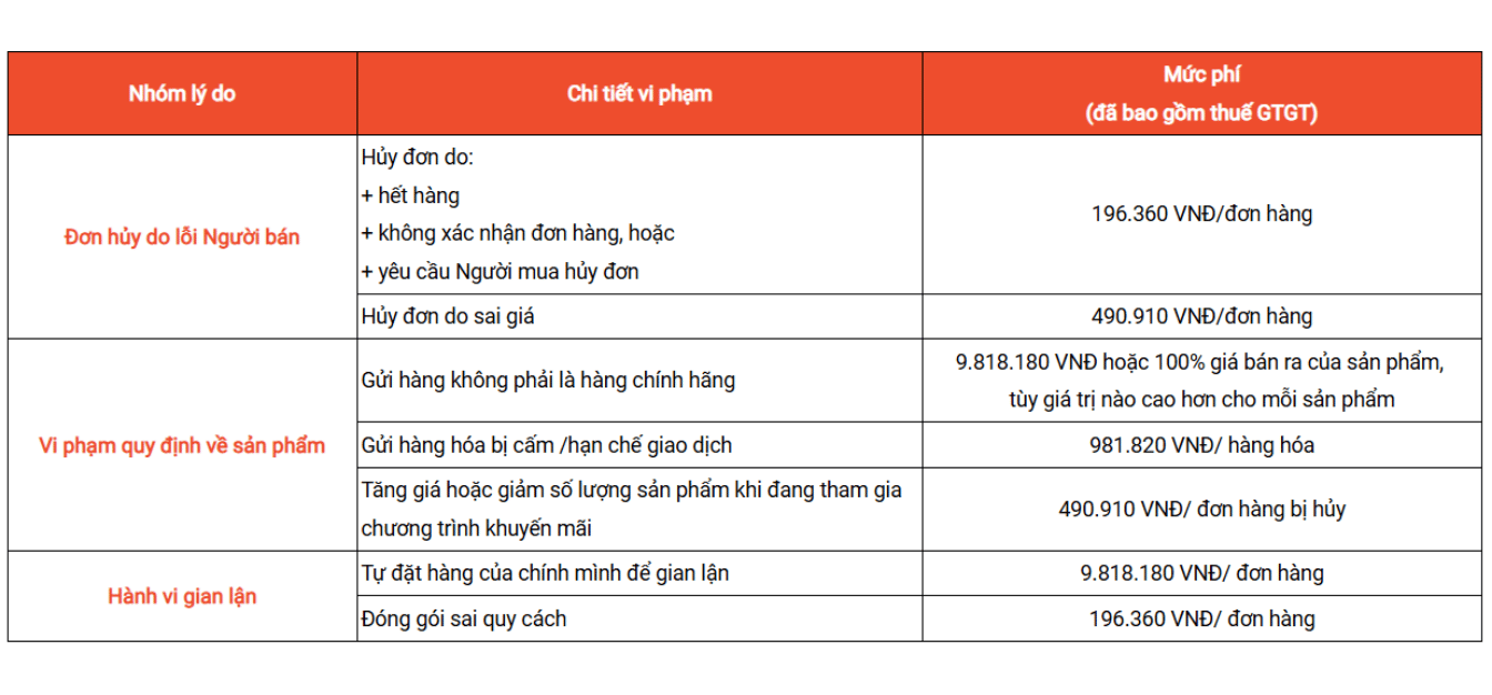 Người bán chủ động yêu cầu hoặc hướng dẫn Người mua hủy đơn hàng vì bất kỳ lý do nào, hệ thống Shopee sẽ ghi nhận đây là hành vi vi phạm và áp dụng mức phí dịch vụ tương ứng theo quy định.