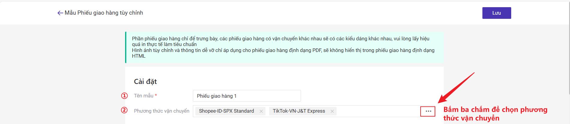 Bấm Cài đăt > Bấm Cài đặt in > Bấm In phiếu giao hàng > Bấm "+ Thêm mẫu"