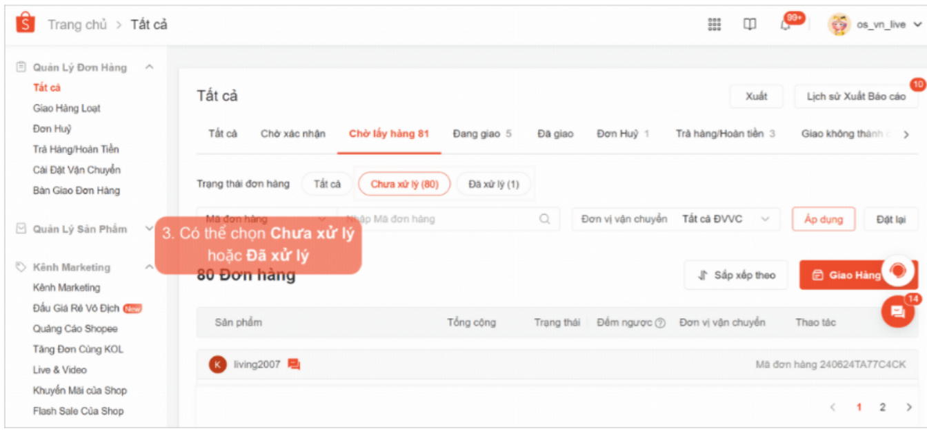 Bước 3: Nhấn vào mục Chưa xử lý hoặc Đã xử lý để kiểm tra và xác nhận các đơn hàng.