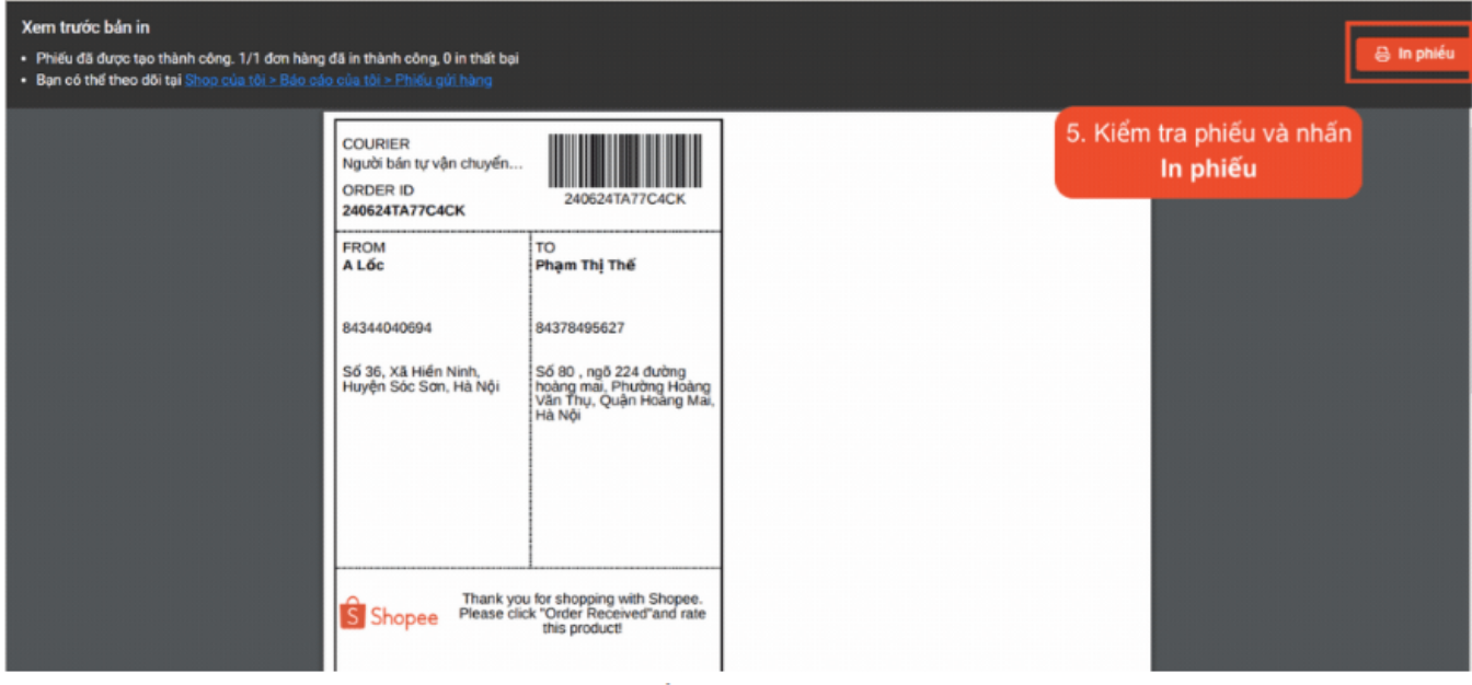 Bước 5: Hệ thống sẽ tiến hành tạo phiếu. Người bán hãy kiểm tra phiếu đã tạo và chọn nút In phiếu để tiến hành in.
