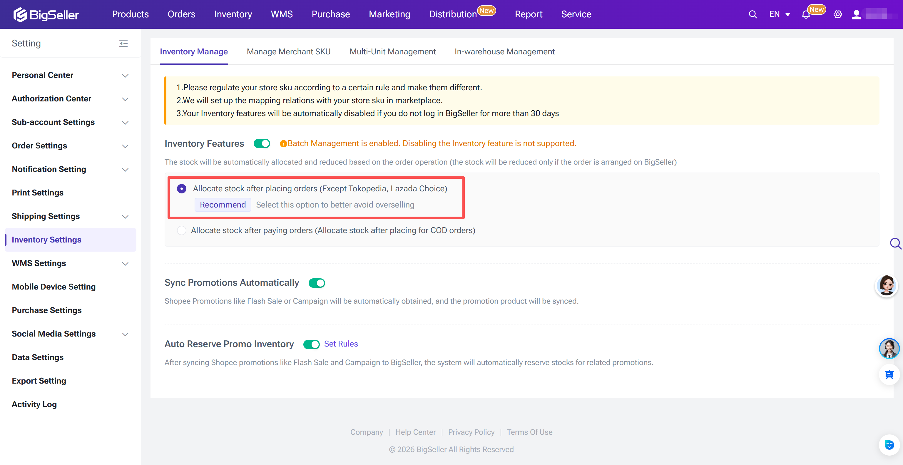Once inventory feature is enabled, BigSeller will push stocks to all platforms and stores whenever the inventory quantity of a merchant SKU changes, based on the push rules, effectively preventing overselling of orders.